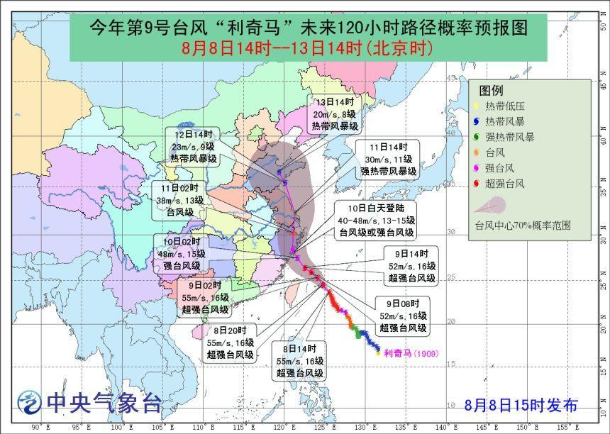 今年第9号台风“利奇马”(超强台风级)16时其中心距离文成东南方向约690公里的洋面上,近中心最大风力16级(55米/秒)。预计“利奇马”将以每小时18公里左右的速度向西北方向移动,强度变化不大。预计10日白天将在浙江沿海登陆或紧擦浙江近海北上。受“利奇马”台风影响,9-10日我县将有明显风雨过程。