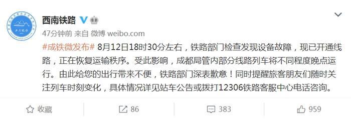 @西南铁路 微博通报,8月12日18时30分左右,铁路部门检查发现设备故障,现已开通线路,正在恢复运输秩序。受此影响,成都局管内部分线路列车将不同程度晚点运行。
