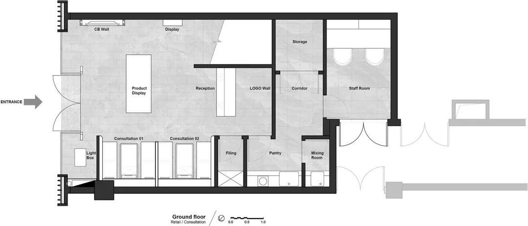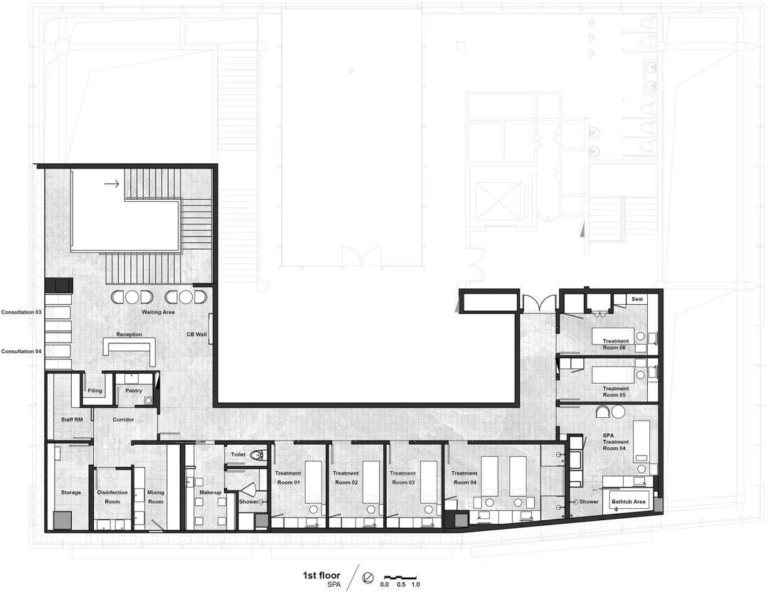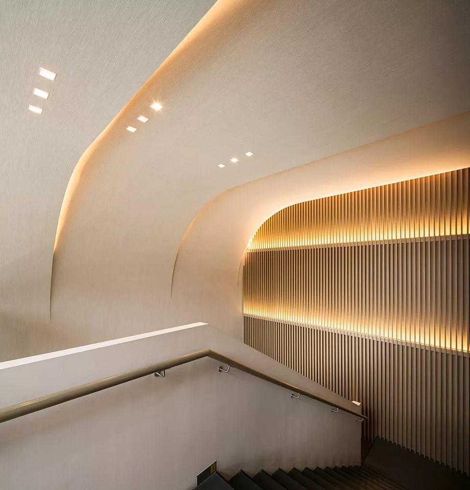 零售和理疗这两个服务功能在竖直方向分开。主题楼梯成为一个边界,和一个规划开放/私密,快/慢,疗养/spa空间的过渡区域。顾客沿着楼梯向上时,天花依次折叠,隐藏的上射灯照亮了墙面,营造出一个温暖舒适的氛围。第二层的空间单纯地被地灯照亮,这些地灯轻轻掠过墙面的底部,为顾客创造出一种禅意的体验,带领他们远离城市的喧嚣和繁忙。