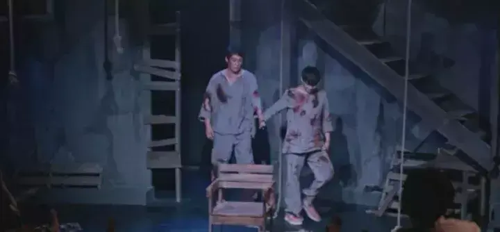 最后,话剧上映了,生无可恋的小奶狐没有扣安全锁想要结束自己的生命,大叔发现不对救下了他,观众赞叹两人的演技,并没有发现这不是演出。