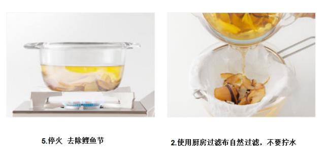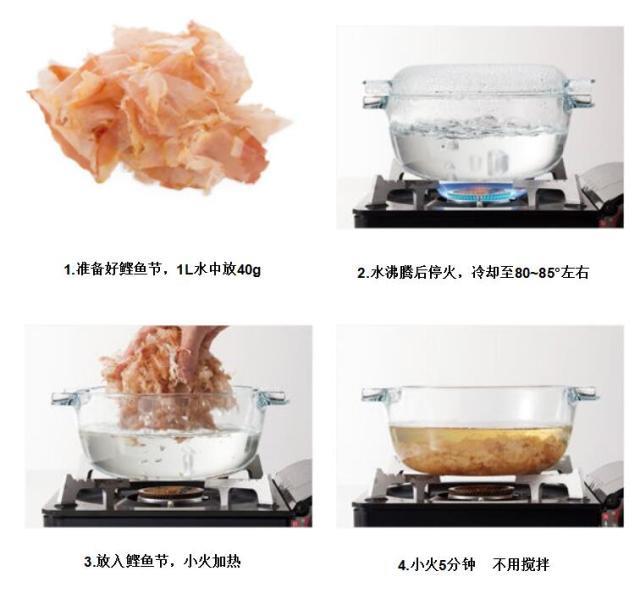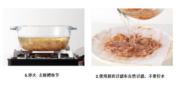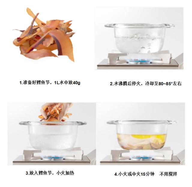 将鲣鱼干厚刨后,制作汤品顺序如下: