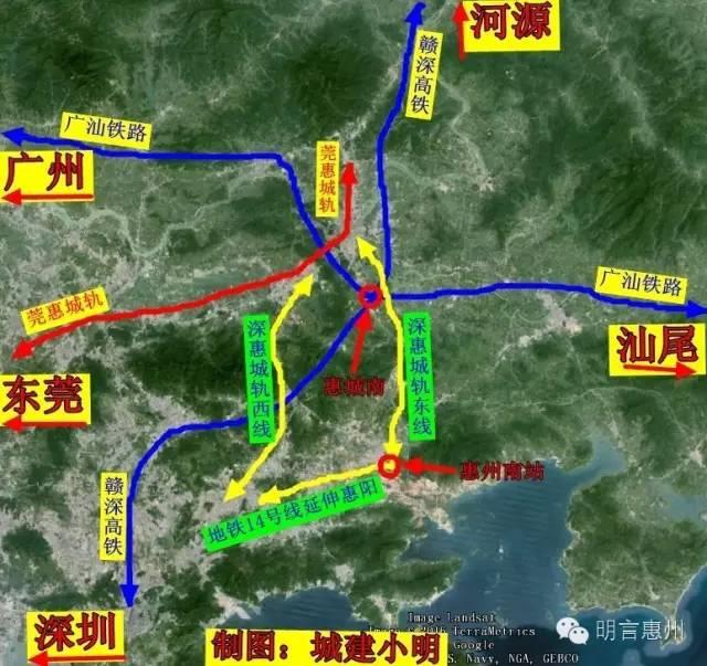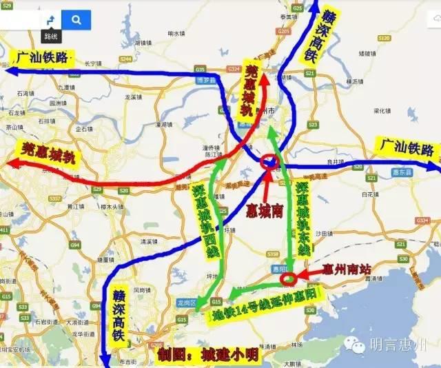 赣深高铁惠州段长约101.8公里,设计时速350公里/小时,设站3站,初步设置有惠城南站等。计划2016年开工,2020年建成,总投资201.4亿元;