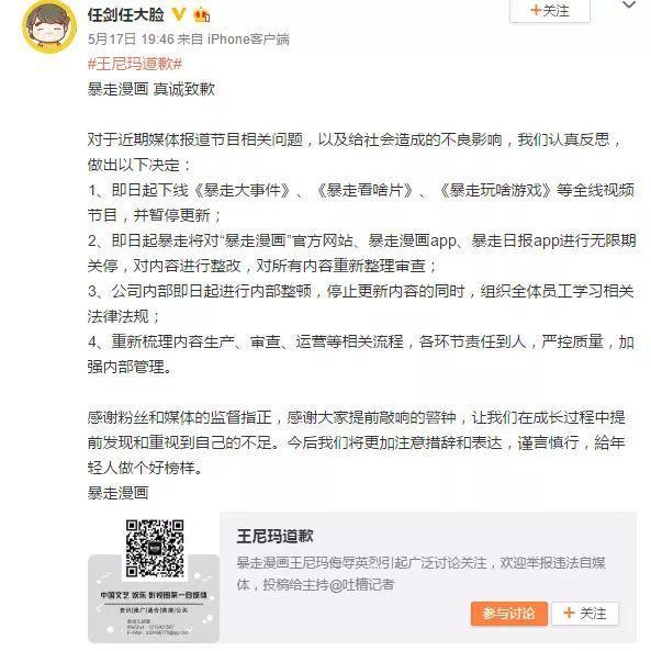 暴漫公司CEO任剑昨晚公开致歉,并宣布了一系列整改措施: