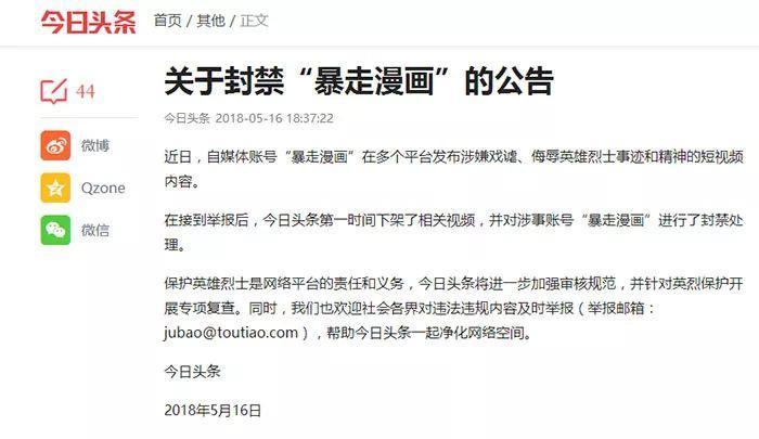 不过在5月1日《英雄烈士保护法》正式实施后,暴走漫画成为了第一个因此而遭到封杀的对象。现在几乎全网各大平台都已经封杀了暴走漫画。