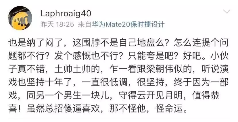 昨天编剧汪启楠发微博diss朱一龙粉丝没素质不分场合大声叫,小笼包这次表现的比较平和,客气的要求他删除微博。可对方刚删除就又发微博说朱一龙土帅土帅的,乍一看像梁朝伟,同另一个男生一块儿守得云开见月明,虽然总招傻逼喜欢,那不怪他,怪命运。