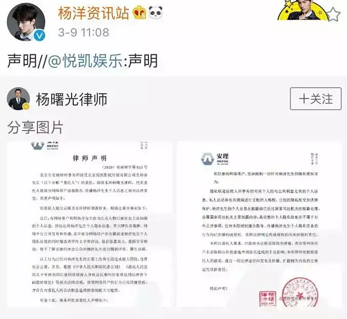 杨洋因为个人信息遭到蓄意传播今天还特地发声明维护隐私权,要求立即删除相关内容,并将通过法律途径维权。