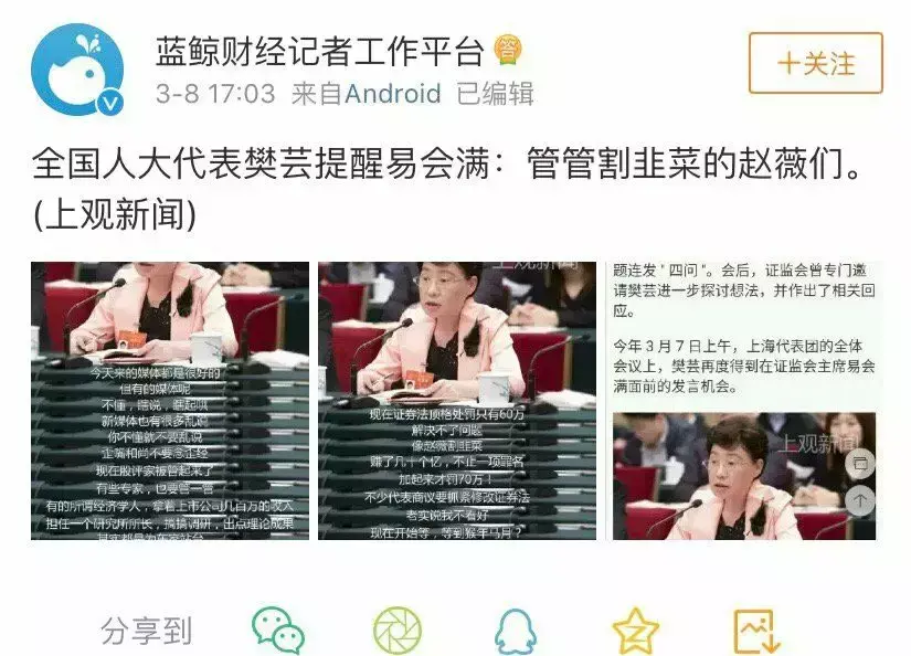 这次又被财经频道的某位代表点名,要求管管割韭菜的赵薇们,看来余震还在。不过说的话有点不准确,因为收购都失败了,这要是能赚几十亿估计不太可能。