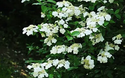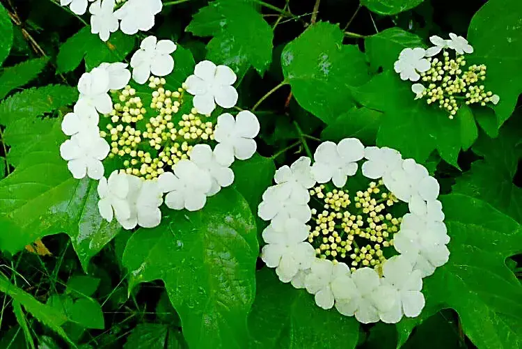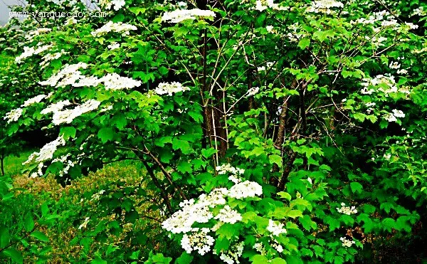 鸡树条。高约3米。小枝有明显皮孔,叶宽卵形至卵圆形,通常有3裂,裂片边缘有齿,掌状三出脉。复聚伞形花序,径8-12厘米,生于侧枝顶端,边缘有大型不孕花,中间为两性花,花冠乳白色,辐状;核果近球形,鲜红色。花期5-6月,果期8-9月。