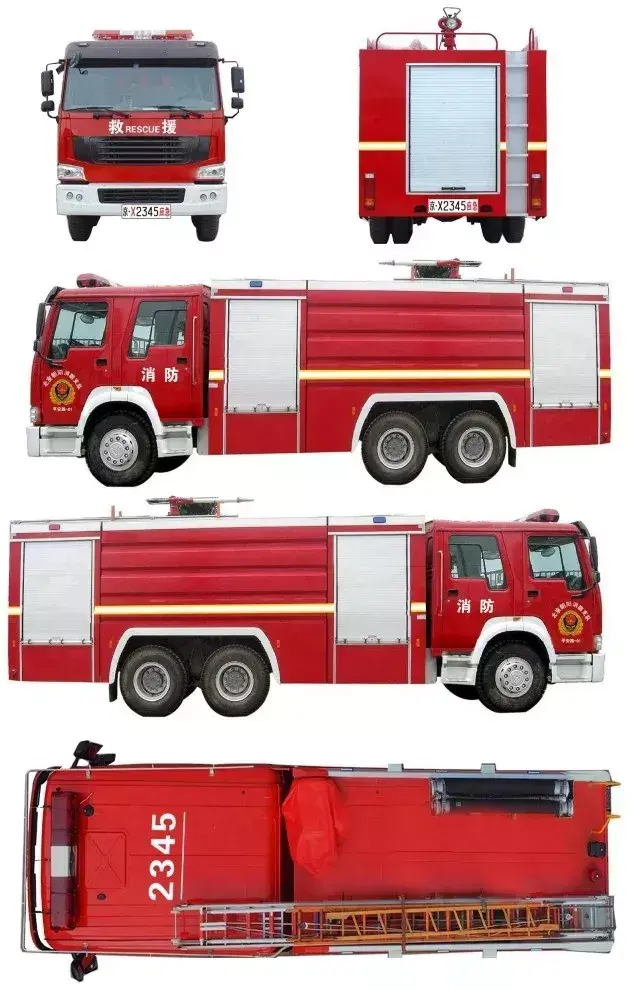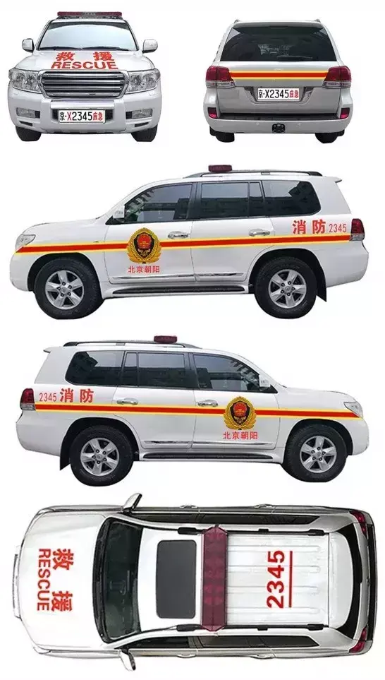 备注:悬挂专用号牌车辆外观参照国际通行做法进行标识涂装,车身前面涂装“救援RESCUE”字样,车身侧面涂装国家综合性消防救援队伍徽标、“消防”字样和所属单位名称、车辆编号,车顶涂装车辆编号,车身两侧及车辆尾部涂装装饰条。