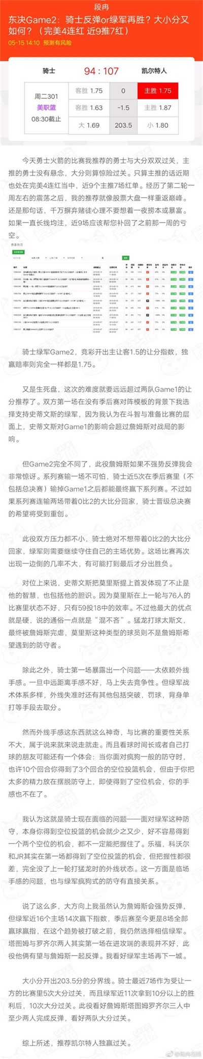 段冉在微博郑重声明:是的,今天我支持绿军,昨天支持勇士,前天支持绿军。你们猜对了嘛那些骂我偏火箭的人啊,咱以后听话要听音,不能通过声调和音量判断然后就开骂哈,显得太外行了!当然了,支持勇士只是昨天而已,明天支持谁就得明天赛后再公布喽!