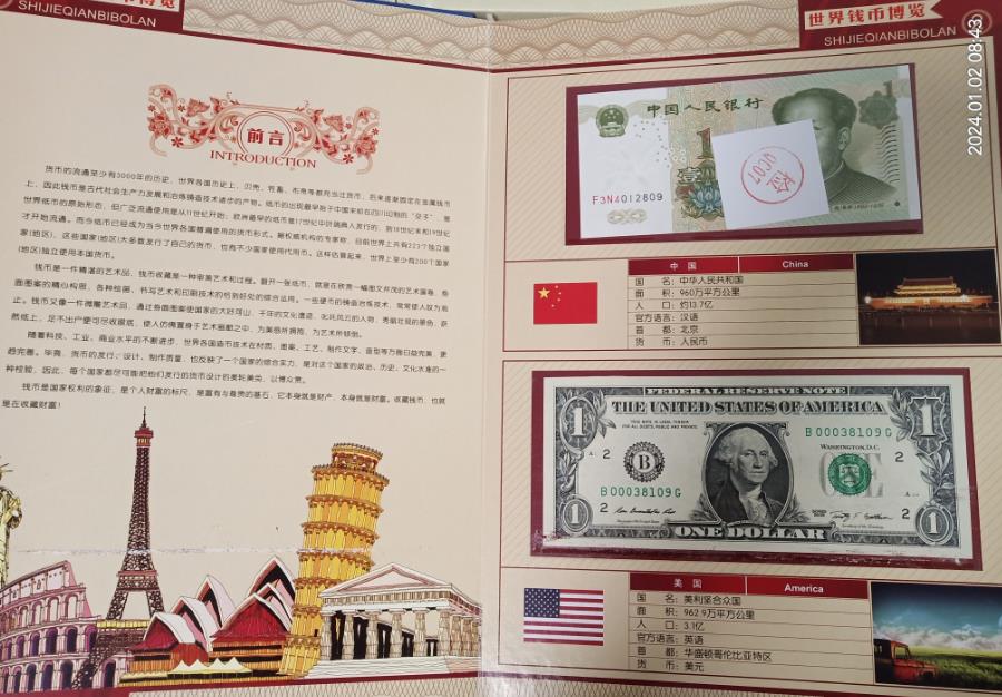 我们买了一本由六十国外币组成的册子,80元,里面都是小面值的外币,孩子很开心,一回家就迫不及待地翻看里面地内容,津津有味地读起了各国的面积、人口、官方语言等信息。还上网查询各国货币对人民币的汇率,以及货币上的人物、图案的来历,真是物有所值了。