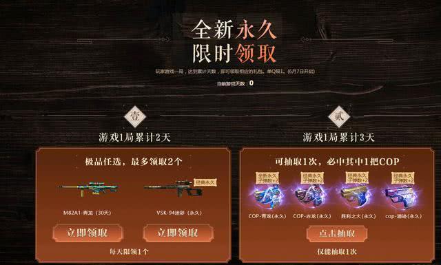 紧接着,只要在活动期间,累计3天登录游戏并且玩满一局,大家别忘了这个活动哟,前俩把武器小编觉得是纯鸡肋,但是COP四选一可以说还是非常不错的,在这四把武器中,小编比较喜欢两把,青龙和赤龙。金龙缠绕的枪身还是很漂亮的!