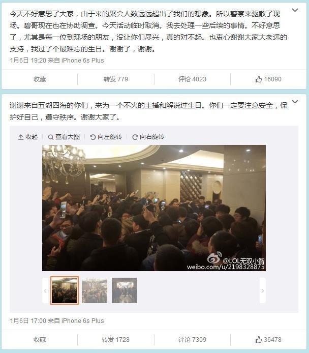 早先,《LOL》知名解说小智就曾在微博里放出消息,将于1月6日在葫芦岛宴请水友,但由于现场过于火爆,遭到了警察驱散。