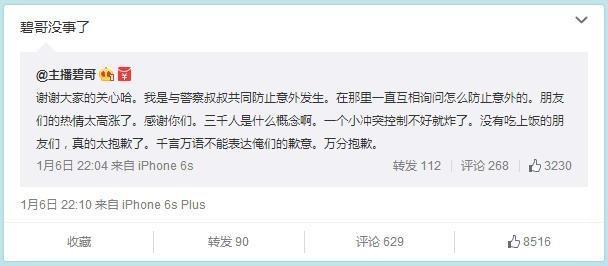 1月3日,碧哥在微博上公布消息,定在1月6号的晚6点葫芦岛的某酒楼,但是由于参与此次吃饭活动的人数太多,直接惊动了当地警察,于是警察叔叔以聚众人数太多对现场进行了驱散,而当事人碧哥也在现场与警察进行协调,希望活动能继续进行。