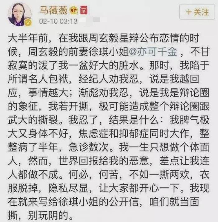 周玄毅的前任是知名女星马薇薇,他原本有一段婚姻,却在录制《奇葩说》的过程中与马薇薇相恋。前妻还为此发文曝光,与马薇薇在社交平台唇枪舌剑展开争执,力证周玄毅婚内出轨。