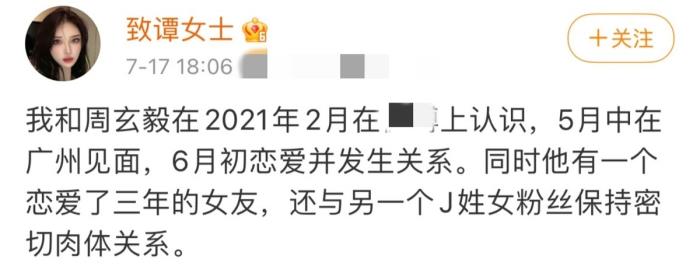 7月17日,一位网名为“致谭女士”的网友在社交平台发文。自曝与武汉大学教授周玄毅恋爱且发生关系,对方有一位相恋三年的女友,并与多位女孩保持同样关系。
