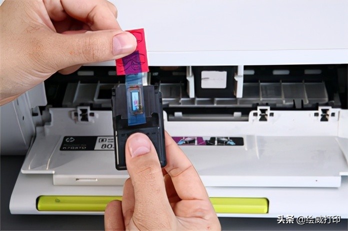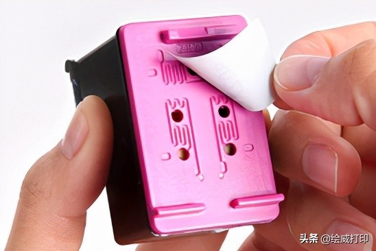 1. 将墨盒从打印机中取出,撕下墨盒上的标签,即可看见加墨口