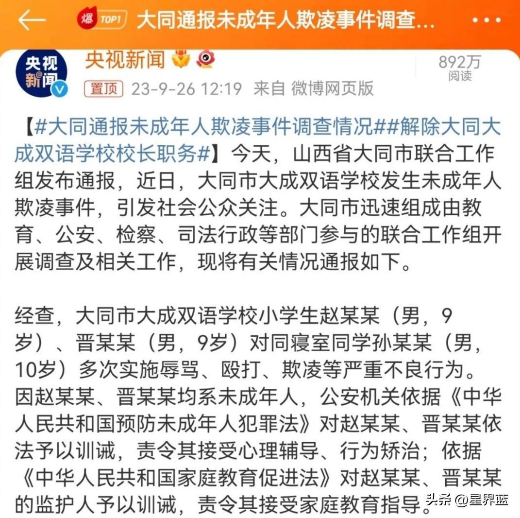 #山西大同大成双语学校霸凌事件##解除大同大成双语学校校长职务##校园暴力##媒体:温柔处理打不疼欺凌者#