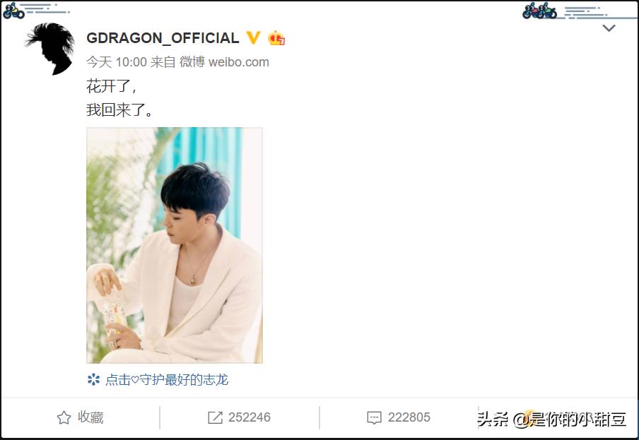 这是他继去年11月底退伍之后,首次在中国的社交网站上发声。在那之前,权志龙的微博最后一条一直停留在他2018年2月18日入伍前夕更新的最后一条:“下次花开的时候,再会。” 也暗示与粉丝定下承诺,在花开之际自己会重新回到粉丝面前,在那之后就开始了长达两年的入伍生涯。所以这次微博写下的回归七字宣言也兑现了自己当初对粉丝的承诺。