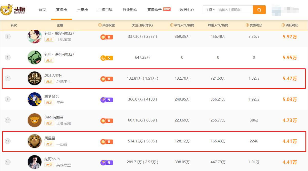 注:由于"虎牙天命杯"与"周星星"属于虎牙官方直播间,因此将名次延后至第12位。