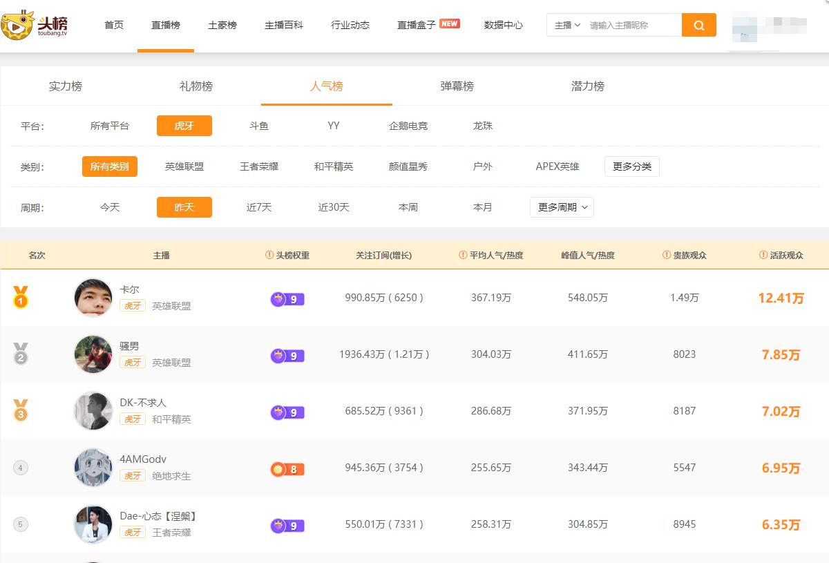 虎牙人气主播排行榜:蛇哥状态回升,LOL卡尔稳坐第一