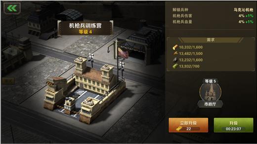 每当训练士兵时,需要消耗一定的资源和时间,训练完成后会储存在城市中,战斗时可以派遣上阵。升级兵营可以解锁更高级的士兵,相比于低级士兵,高级士兵会消耗更多的资源和时间,但是拥有更强大的属性。
