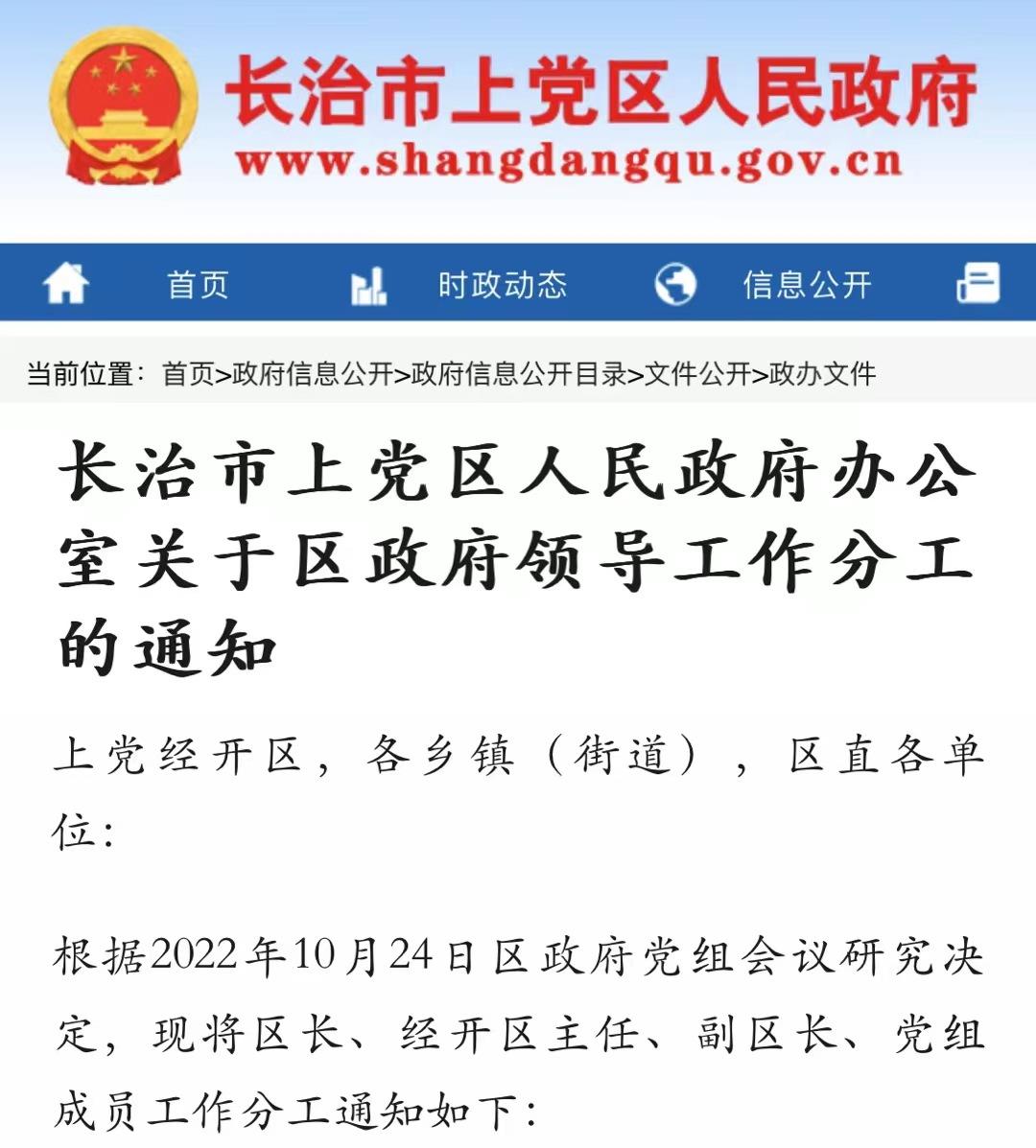 长治市上党区政府办公室“关于区政府领导工作分工的通知”最新发布;根据10月24日区政府党组会议研究决定,区长、经开区主任、副区长、党组成员工作分工通知如下。