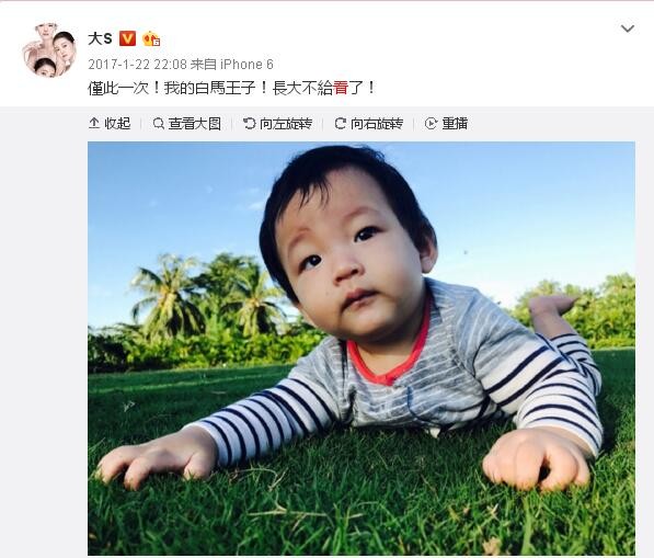 女儿曝光率太高以至于几乎没怎么看到儿子长啥样,只有去年的时候,妈妈大s晒过几张图,并且说了只给大家看着一次,长大之后就不给看了。从照片看,弟弟和姐姐五官非常像。