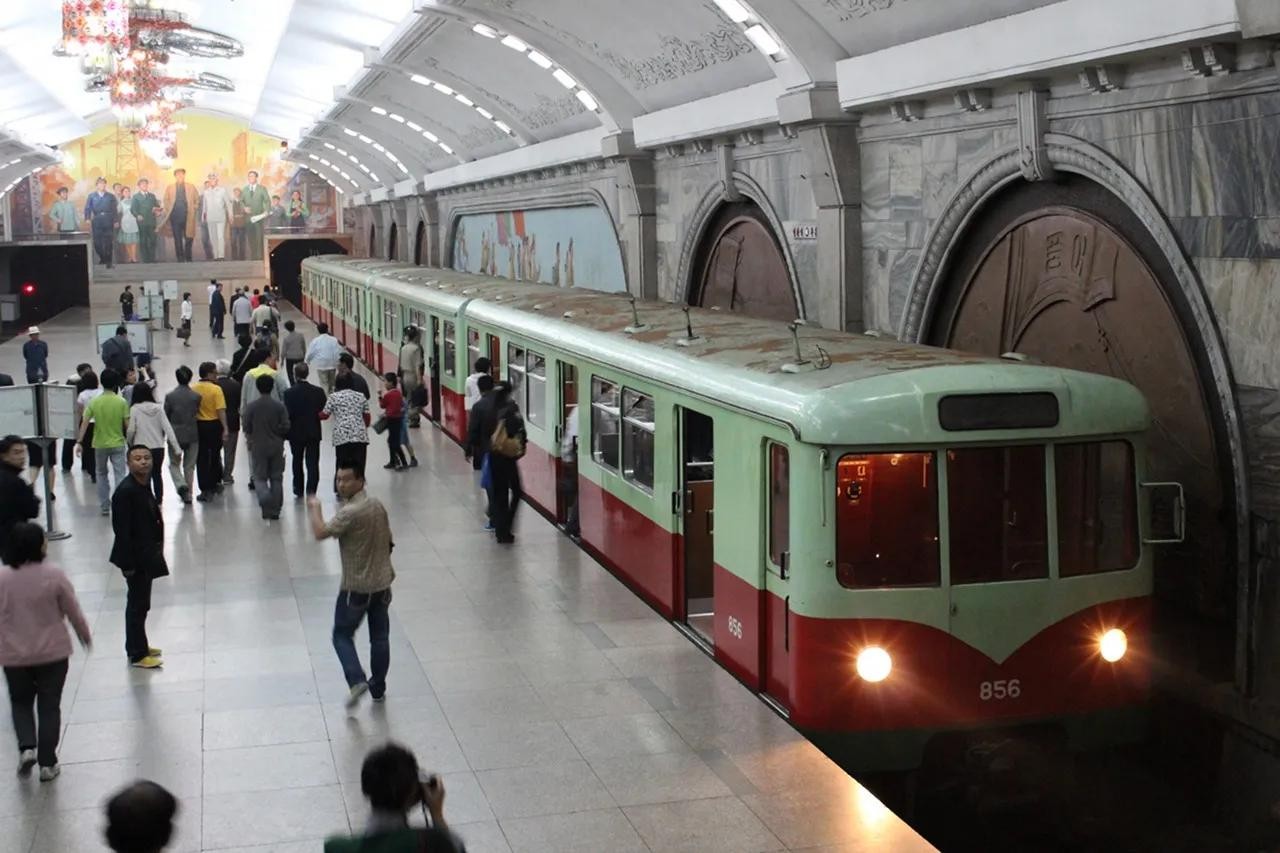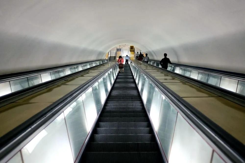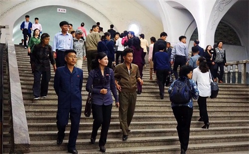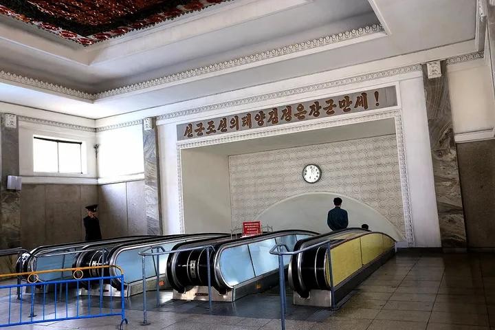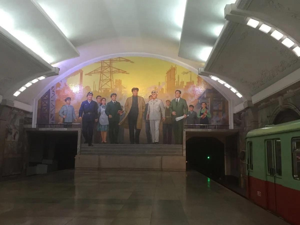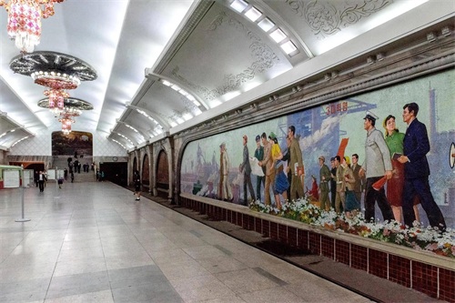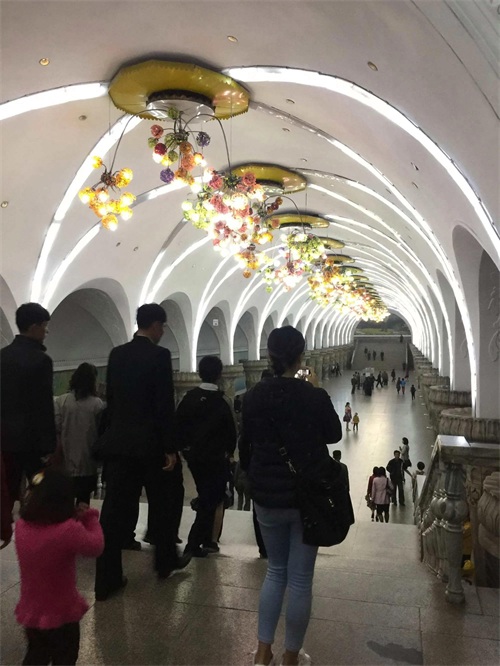 凡是外国来到朝鲜观光旅游的游客在跟团游览的过程中,平壤地铁是重要的一站。从地上进站口乘坐扶梯直达地下。平壤地铁的扶梯我从没有乘坐过的,我觉得倾斜角度达到了60——70度,大概称作两三分钟的时间,我们就来到了一百多米的地铁运营层面,这里宽敞明亮,红绿相间的琉璃吊灯彰显品味,用人工宝石粘贴而成的巨幅壁画巧夺天工,一趟趟地铁往来穿梭,有条不紊。车厢里卫生整洁,乘客井然有序。