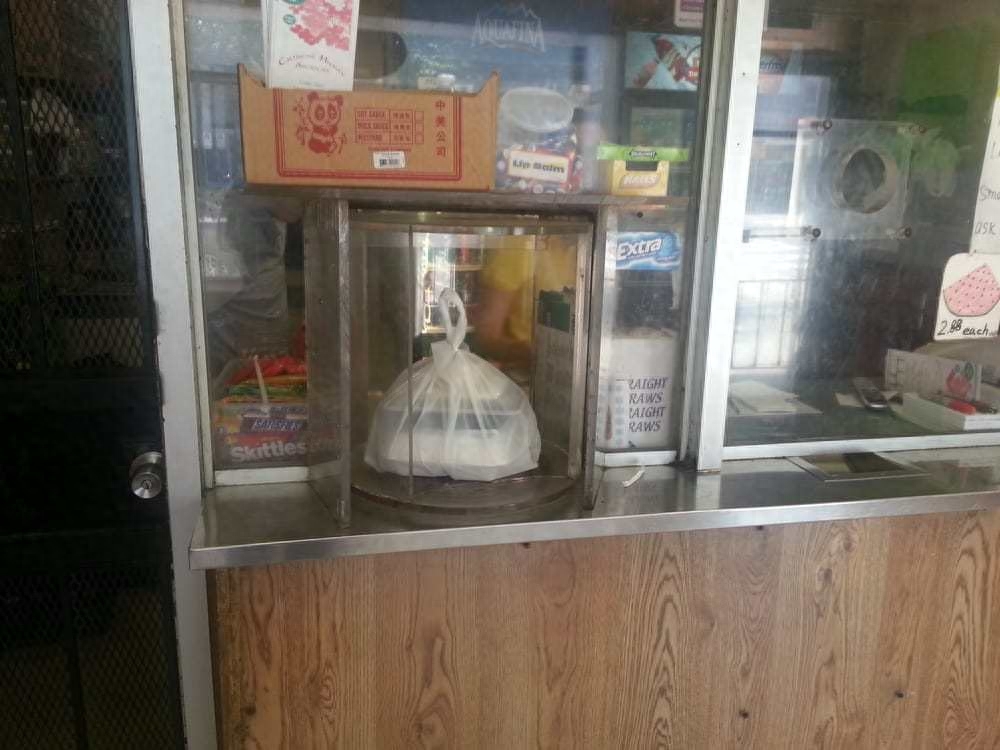 美国贫民窟中餐外卖店防弹玻璃保护窗,收银员不敢直面顾客,怕被枪指着头抢劫: