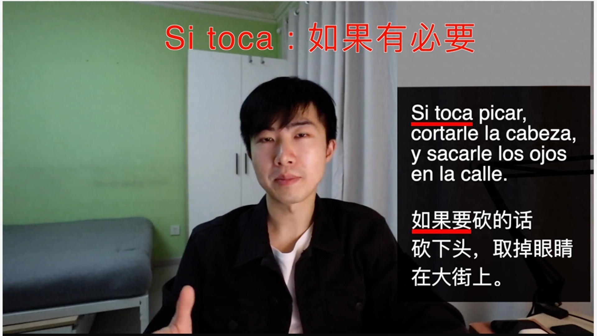 在这里黑帮成员说的是:“Si toca...”,Si toca 是西语中的一种假设和虚拟:“如果有必要...”。黑帮成员那句话的意思是:“如果有必要砍人,我们会在大街上割脑袋,挖眼珠。”