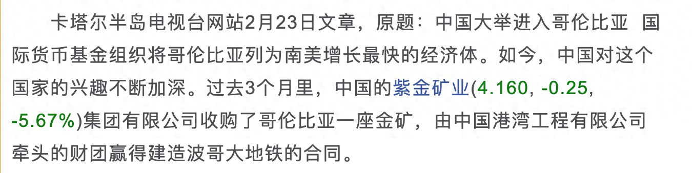 前几天卡塔尔半岛电视台报道:“中国大举进入哥伦比亚,4年内在哥伦比亚的中资企业增多了3倍,从20家增加到80余家。过去3个月里,中国的紫金矿业集团(花10亿美金)收购了哥伦比亚一座金矿,由中国港湾工程有限公司牵头的财团赢得建造波哥大地铁的合同。”