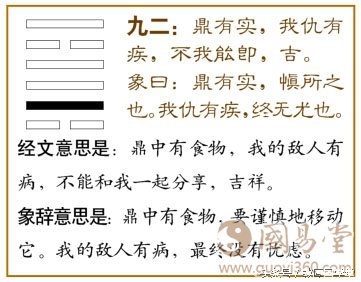 鼎卦第二爻,爻辞:九二:鼎有实;我仇有疾,不我能即,吉。爻辞释义
