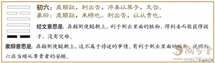 鼎卦第一爻,爻辞:初六:鼎颠趾,利出否;得妾以其子无咎。爻辞释义