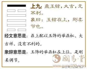 鼎卦第六爻,爻辞:上九:鼎玉铉,大吉,无不利。爻辞释义