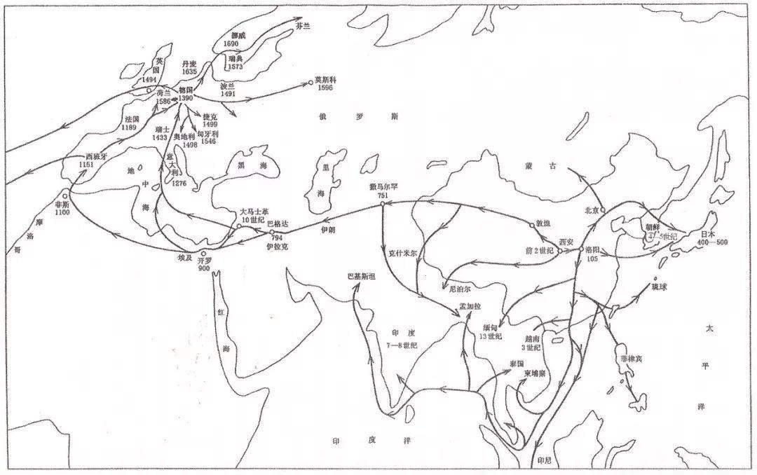 公元2世纪到5世纪,我国的纸与造纸术先后传到越南、日本、朝鲜,8世纪传到中亚,12世纪经阿拉伯传入欧洲。潘先生经过细致考证,绘有一传播路线图(图2),不妨一览。
