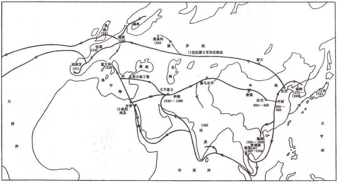 图2 中国造纸技术外传示意图(潘吉星绘)