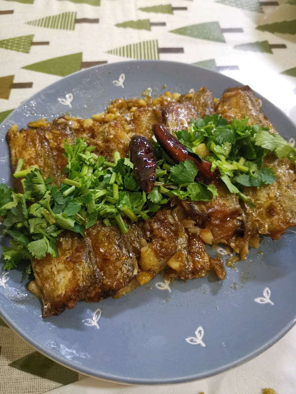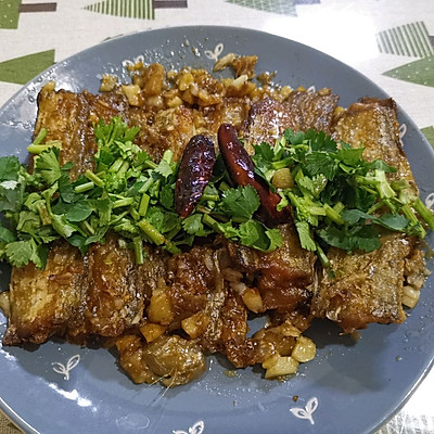 带鱼 一斤 生姜 4片 大蒜 2瓣 生抽 1勺 老抽 半勺 盐 少许 料酒 一勺 白糖 一勺 香菜 1根 干辣椒 2-3个 蚝油 1勺 陈醋或白醋 半勺 淀粉或面粉 一小碗