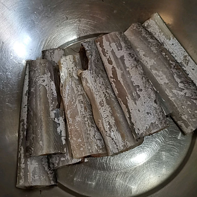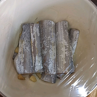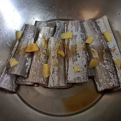 1、带鱼去头去尾洗净切段,把肚子里黑色的膜去掉,不然会腥