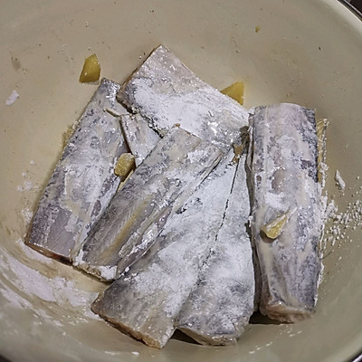 7、用淀粉包裹住鱼段,用手轻揉以保证粘上,这样一会煎的时候不容易粘锅