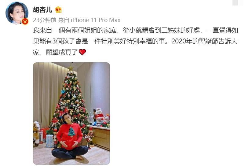 12月25日,41岁的香港女演员在自己的社交平台上官宣怀孕:"我一直觉得如果能有3个孩子会是一件特別美好特別幸福的事,2020年的圣诞节告诉大家,愿望成真了。"