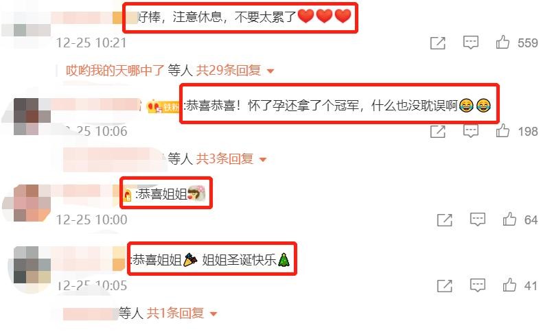 胡杏儿传出喜讯,网友们纷纷送上真诚的祝福。有的网友说:"胡杏儿好棒,注意休息,不要太累了。"也有的网友在恭喜的同时还对胡杏儿表示了夸奖:"恭喜恭喜!怀了孕还拿了个冠军,什么也没耽误啊!"网友们的语气中充满了溢于言表的祝福和对胡杏儿的赞美。