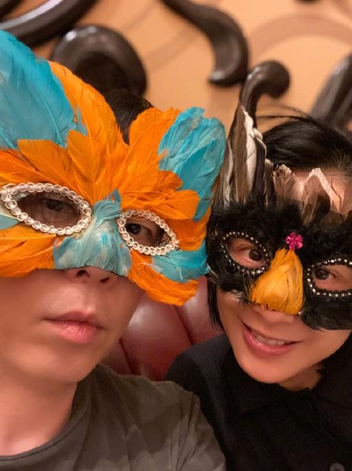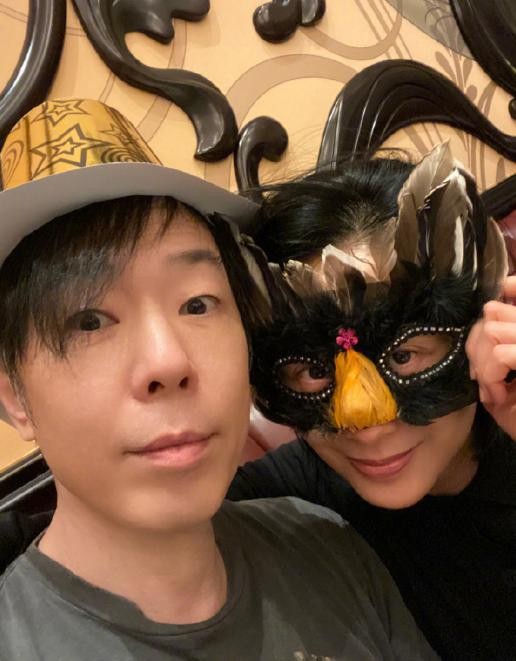 朱茵戴着面具,十分的搞怪,她纯素颜出镜,但面具下面还可以看出她的皮肤状态非常地好,的确是粉丝心中的不老女神,她搂着黄贯中的肩膀略显娇羞,动作非常地亲密。