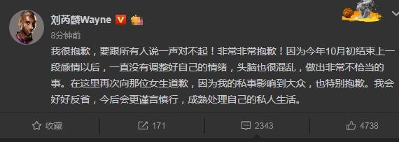 刘芮麟说:“我很抱歉,要跟所有人说一声对不起!非常非常抱歉!因为今年10月初结束上一段感情以后,一直没有调整好自己的情绪,头脑也很混乱,做出非常不恰当的事。在这里再次向那位女生道歉,因为我的私事影响到大众,也特别抱歉。我会好好反省,今后会更谨言慎行,成熟处理自己的私人生活。 ”