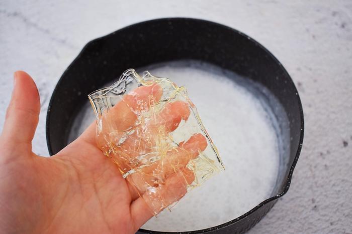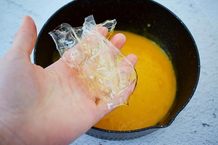 2、将准备好的吉利丁片放入干净的碗中,然后将吉利丁片放置在碗中,加入冷水,然后泡软备用。
