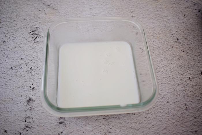 9、准备好一个干净的容器,然后用椰汁倒入容器中,薄薄一层即可,厚度可以按照自己的喜好调整。