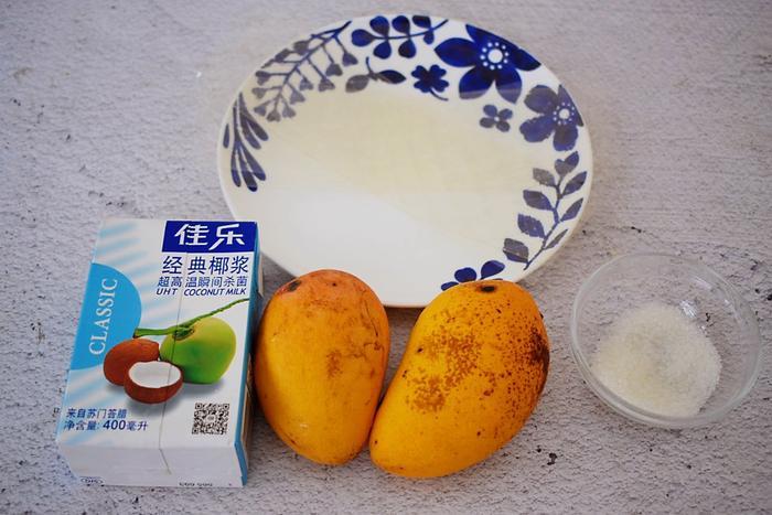 芒果适量、椰浆适量、吉利丁片20g、白糖适量。