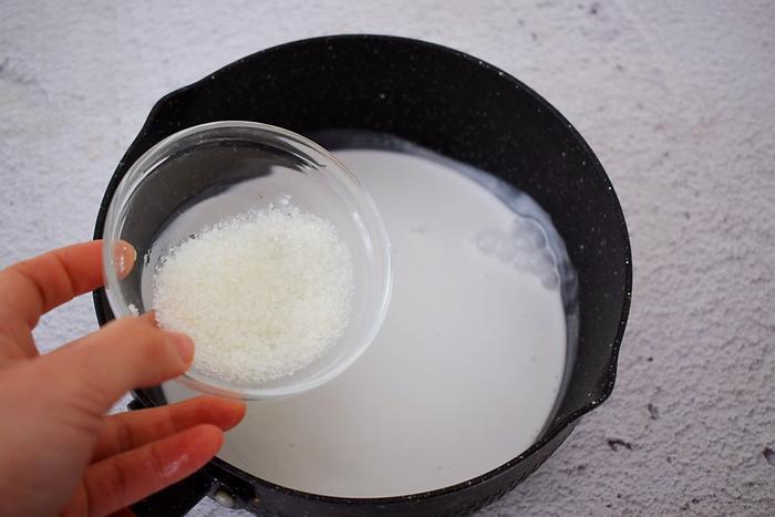 3、锅中倒入适量的椰汁,然后在椰汁中倒入适量的白糖。