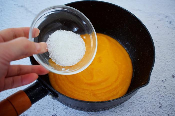 7、将芒果果肉打成泥之后,将芒果泥放入奶锅中加入适量的白砂糖,搅拌至融化即可。