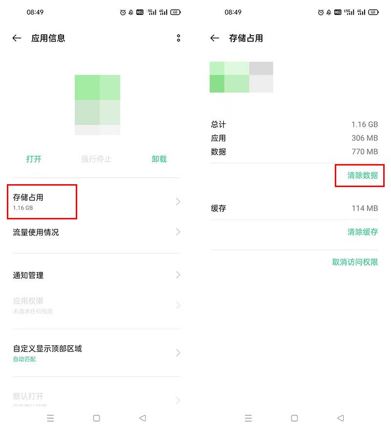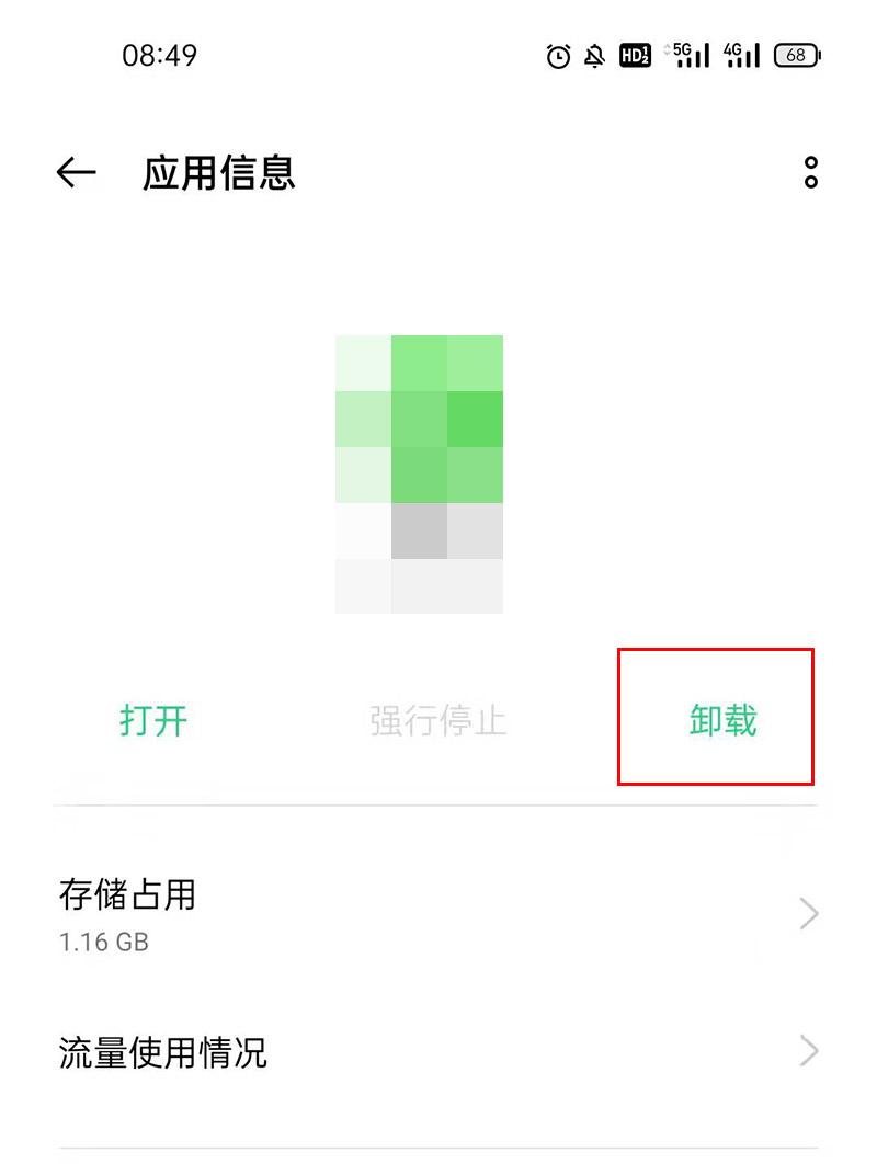 在【应用列表】界面可以看到我们手机上所有的软件,找到你要卸载的那款,点一下它的图标,就会进入这款软件的【应用信息】界面,在这个界面,我们会看到卸载选项,记住这个,下一步要用到,不过这里先别急着点卸载,我们先选择【存储占用】-【清除数据】。